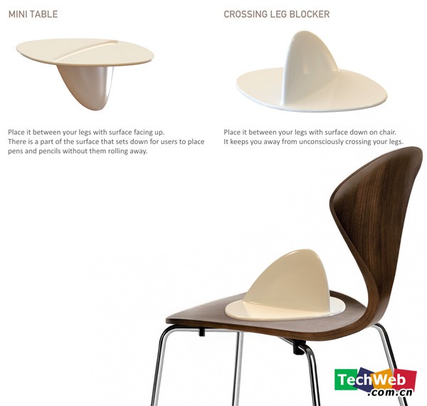 由于人们在平时的日常生活中,不注意坐姿,从而导致身体的各个部位出现隐患,所以想要改变身体的状况,就要先从改变坐姿开始。家具的设计应该以方便人们生活为主,而不应该给人的生活与学习带来麻烦,解决人们的后顾之忧,然而研究表明,长期的腿交叉可以导致关节疼痛在膝盖和臀部,设计师 Lucy Jung用这个创意来给你一个正确的姿势,它就像是一个鲨鱼鳍,设计十分简洁,当人们坐在椅子上的时候,你可以把它放在两腿之间,这样你就可以在腿上写字或工作了,又会改变你的不良的习惯。
