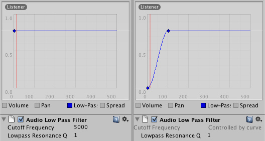标题: 音频低通滤波器(仅专业版) [打印本页] 作者: . 时间: 2013-1-25 15:56 标题: 音频低通滤波器(仅专业版) The Audio Low Pass Filter filter passes low frequencies of an AudioSource, or all sound reaching an AudioListener, and cuts frequencies higher than the Cutoff Frequency.音频低通滤波器(Audio Low Pass Filter ), 通过音频源的低频率,或所有声音达到音频侦听器(AudioListener),并且衰减频率比截止频率高。The Lowpass Resonance Q (known as Lowpass Resonance Quality Factor) determines how much the filter's self-resonance is dampened. Higher Lowpass Resonance Q indicates a lower rate of energy loss i.e. the oscillations die out more slowly.低通共振品质(被称为低通共振品质因数)决定多少滤波器的自谐振被抑制。较高的低通共振质量(Lowpass Resonance Q )表示能量损失率较低,振荡消逝更慢。The Audio Low Pass Filter has a Rolloff curve associated with it, making it possible to set Cutoff Frequency over distance between the AudioSource and the AudioListener.音频低通滤波器(Audio Low Pass Filter)有一个与它关联的衰减曲线,使它可以设置音频源(AudioSource)与音频侦听器(AudioListener)之间随距离的截止频率(Cutoff Frequency)。