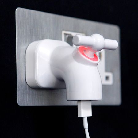 手机没电啦?那就打开水龙头补充点“水分”吧!拧开阀门,充电便开始了,当指示环变成红色,就可以关掉水龙头,拔下插座了。